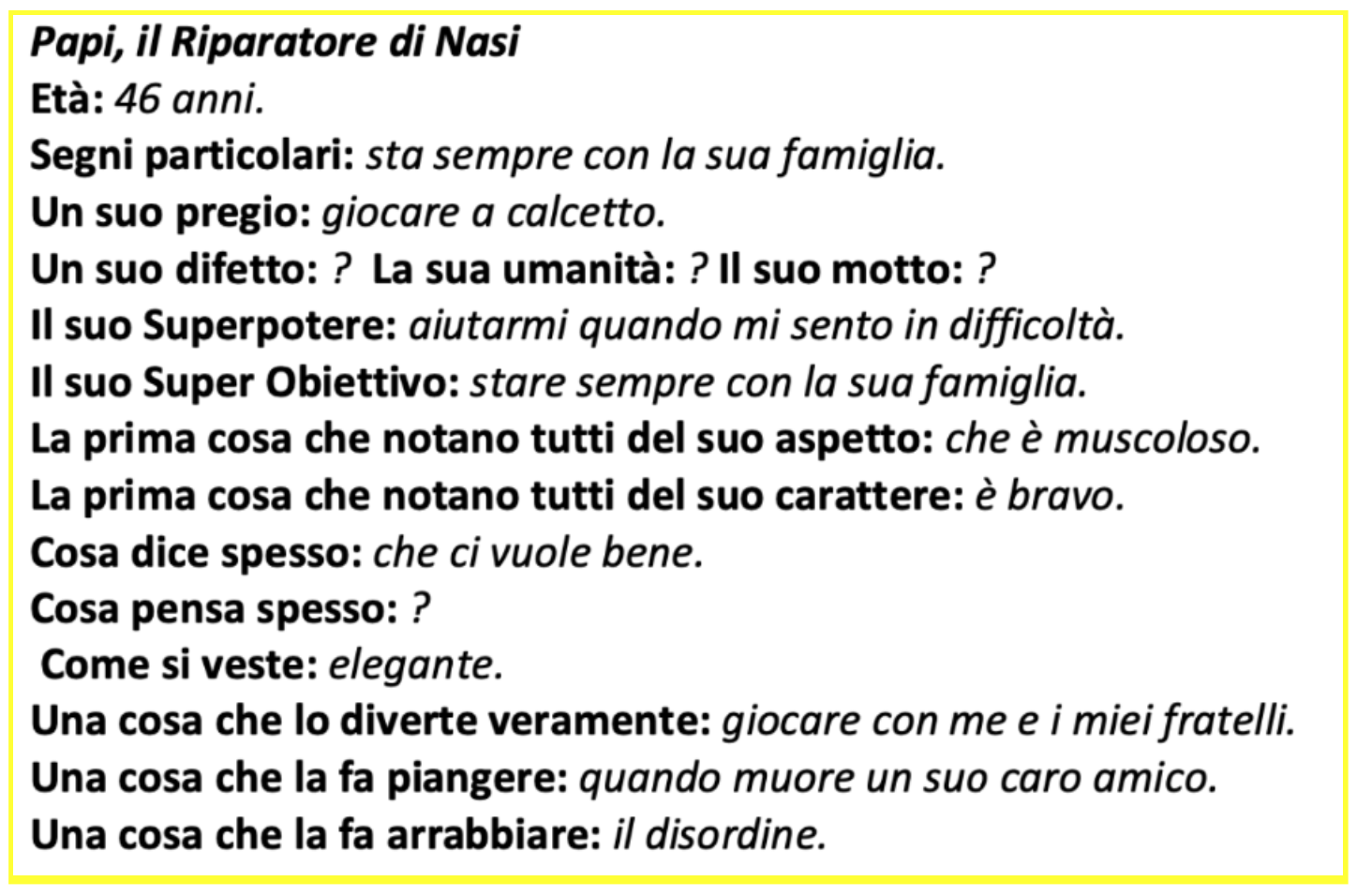 L’antagonista. Nome da inventare. Se ne parla in classe, ma non compare ancora. Com’è. Ha la faccia bianca, è senza occhi e bocca, ha sei braccia, è alto quattro metri e quaranta (ma anche centottantotto metri). È alto, ma ha mani e piedi piccolissimi. Le mani: mani da rana, rossa. Gli occhi sono blu mare. E infuocati. È vanitoso ed elegante: quando combatte ha una cravatta rossa.